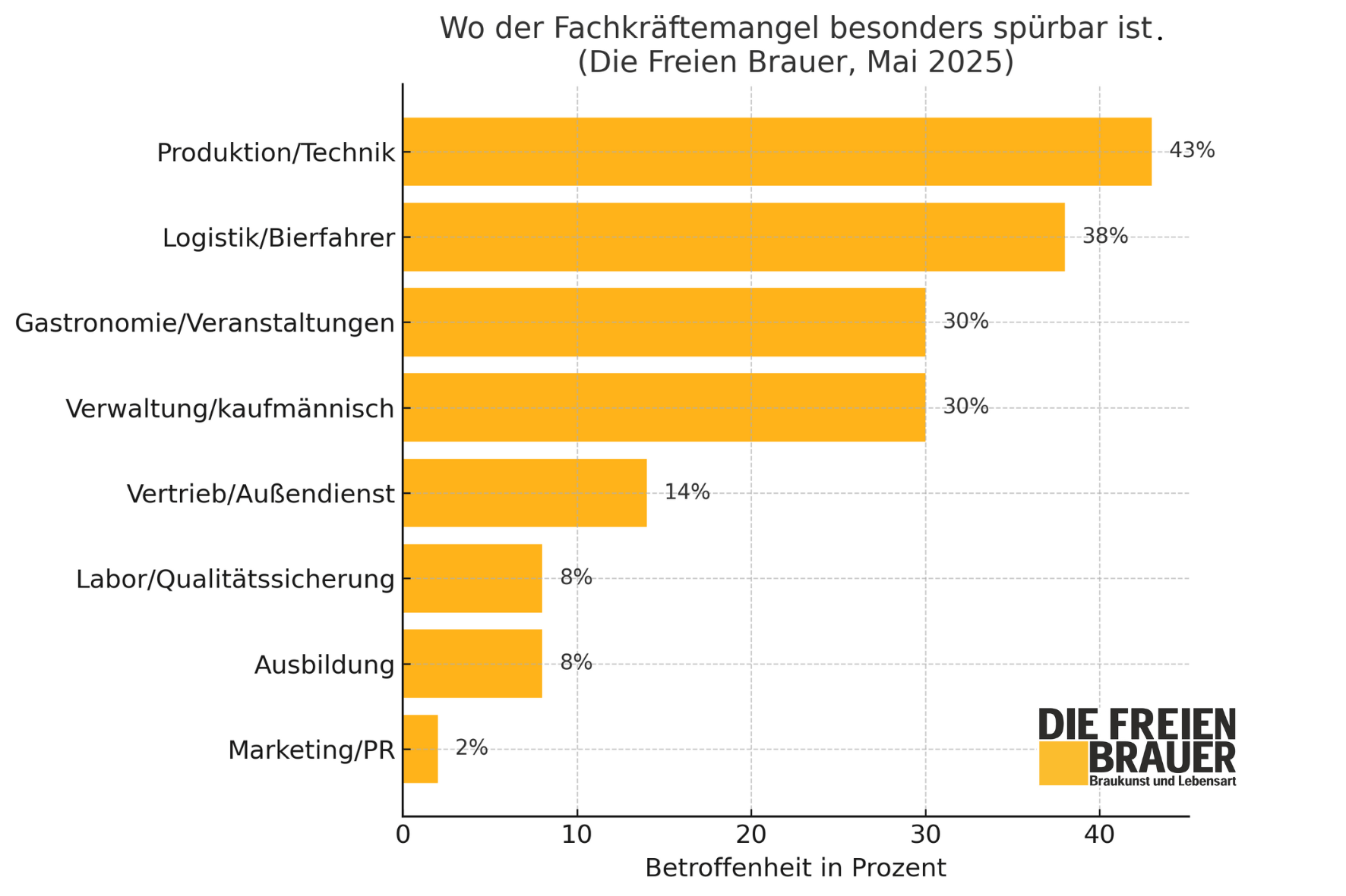 79 % der Teilnehmenden erleben den Mangel als „spürbar, aber beherrschbar“, 11 % stufen die Lage als „sehr stark“ ein. Nur 3 % geben an, derzeit keinerlei Auswirkungen zu spüren. Besonders betroffen sind jene Bereiche, die das operative Herzstück einer Brauerei bilden: Produktion und Technik (43 %), Logistik (38 %) sowie Gastronomie/Veranstaltungsservice und Verwaltung (jeweils 30 %). Damit zeigt sich deutlich, dass vor allem das tägliche Kerngeschäft unter der angespannten Personalsituation leidet.